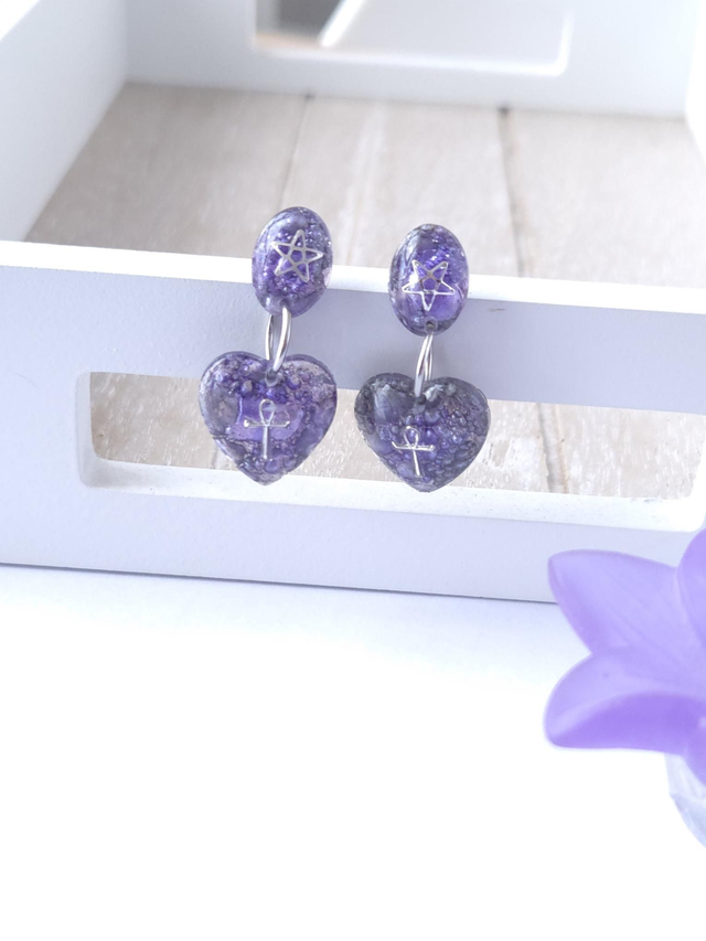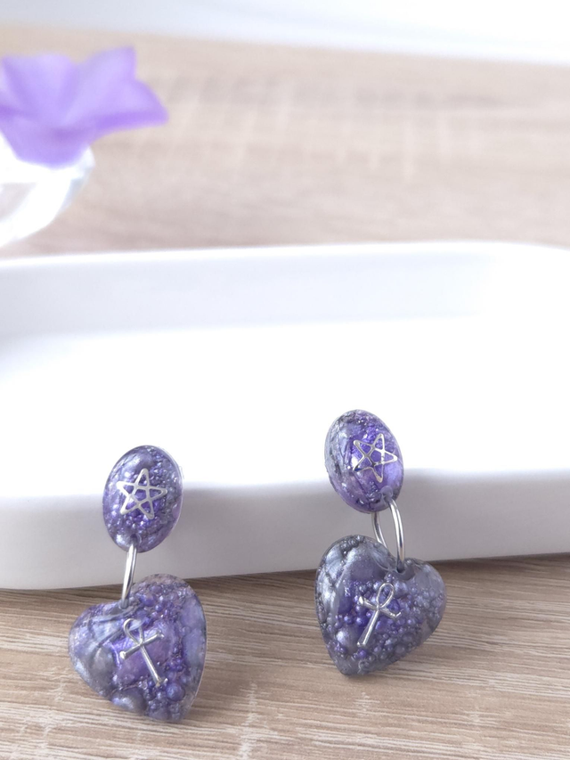 Ces boucles d'oreilles avec leur texture bulles en fond, leurs teintes violette et grise ainsi que la croix égyptienne (Ankh) et l'étoile à 5 branches suggèrent le mystère, la sagesse ancienne et le Féminin.
